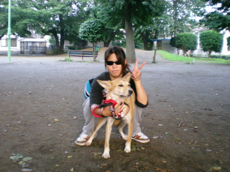 お散歩コースの途中にある公園です。今日はちびっこ達がいないので香はリラックスしてるようですよ。